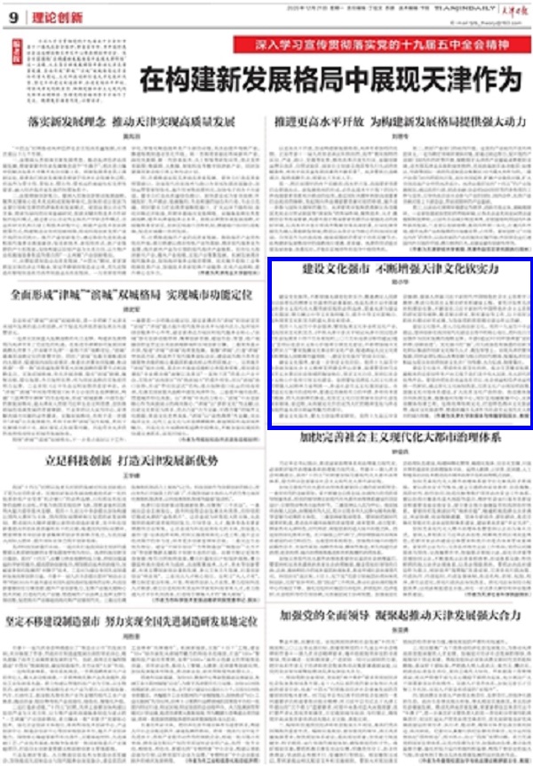 党的十九届五中全会强调,繁荣发展文化事业和文化产业,提高国家文化软实力。《中共天津市委关于制定天津市国民经济和社会发展第十四个五年规划和二〇三五年远景目标的建议》提出“坚持以社会主义核心价值观引领文化建设,不断增强城市文化软实力”“繁荣发展文化事业和文化产业,促进满足人民文化需求和增强人民精神力量相统一,建设文化强市”的奋斗目标。