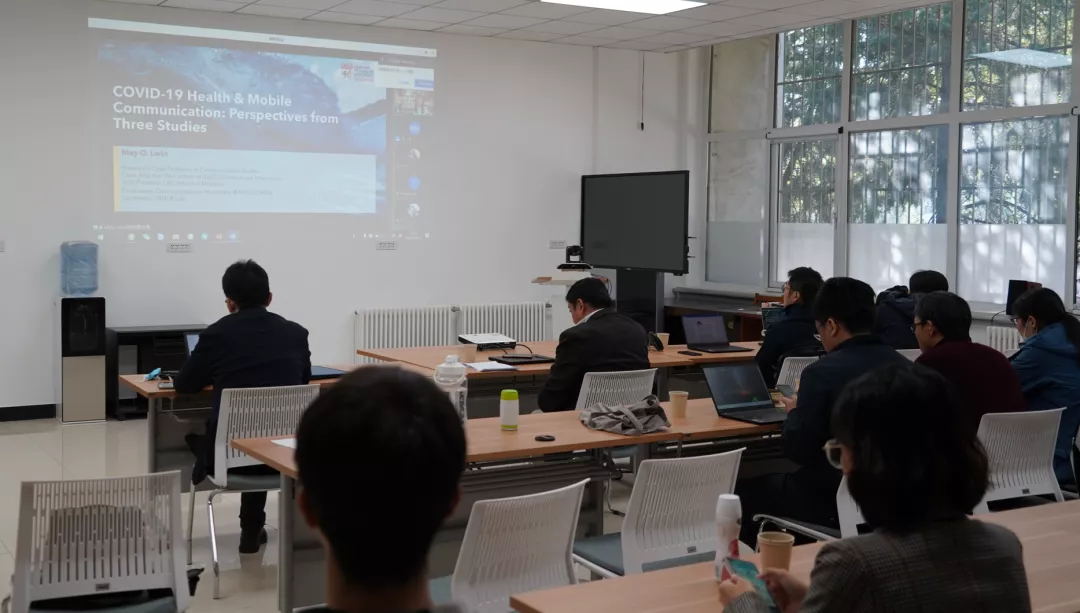 May O. Lwin教授向师生分享了三个针对新冠疫情的跨学科研究项目,展示了如何运用不同的新媒体理论和方法来分析新冠疫情中所产生的网络传播数据,以进行健康传播研究。这些项目通过结合社交媒体大数据分析、手机软件应用和数据算法建模等研究手段,发现社交媒体大数据分析能够有效分析群众在疫情期间的社会心理活动,而手机软件应用则能够被用于对目标人群的心理和健康状态实行追踪;另外,政府和互联网平台向社会公开的如气候、经济、人类活动等数据则能够有效预测新冠疫情的传播态势。