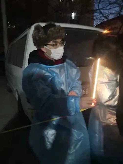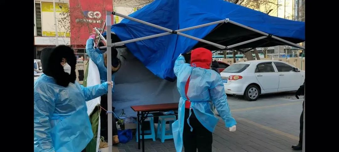 当天十二点,筛查工作开始,由于时间紧任务重,我们发现亟需要更多的志愿者从事样本的转运,身份登记扫码、测温、入户通知和维持秩序等任务。我们在社区发布志愿者招募迅速得到了很多居民响应,特别是很多未成年中小学生也期望加入志愿者队伍(但是被我们劝退),有的居民送来了暖宝宝、暖风机、装满热水的矿泉水瓶,甚至还有鸭脖和刚煮好的红糖姜茶。今天天气零下2度且有大风,帐篷被十几次被吹走了又被支起来,群众的关怀为志愿者在寒风中点亮了一盏灯。