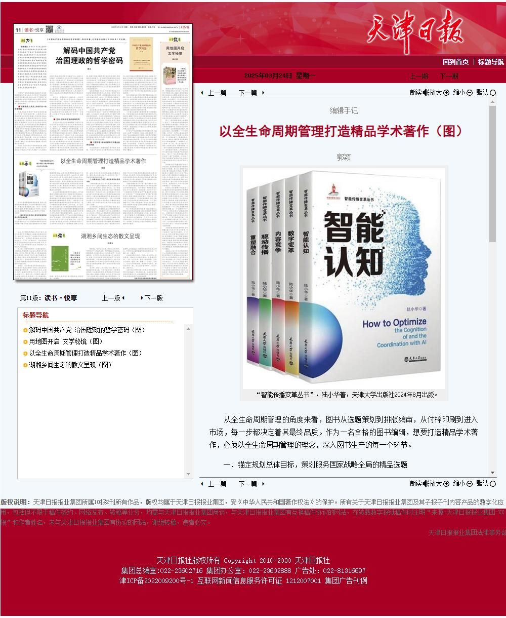 编者按:2025年3月24日,《天津日报》第11版:读书·悦享刊登文章《以全生命周期管理打造精品学术著作(图)》,文章中沙巴体育 出版社智能文化图书事业部主任郭颖从从全生命周期管理理念的角度,对沙巴体育 院长陆小华著“智能传播变革丛书”的策划与出版过程进行了深入介绍与解读。从精准锚定服务国家战略的选题,到统筹规划生产环节确保高效高质出版,再到为提升普适性邀请非专业人员试读并修改,这一系列举措体现了出版人对学术著作全流程的精心打磨。这不仅是对学术内容的深度挖掘与传播,更是对时代需求的积极回应。希望此类以全生命周期管理打造精品的实践能为学术出版领域带来更多启示,推动更多高质量学术成果的诞生与传播,助力知识的广泛普及与社会的全面进步。